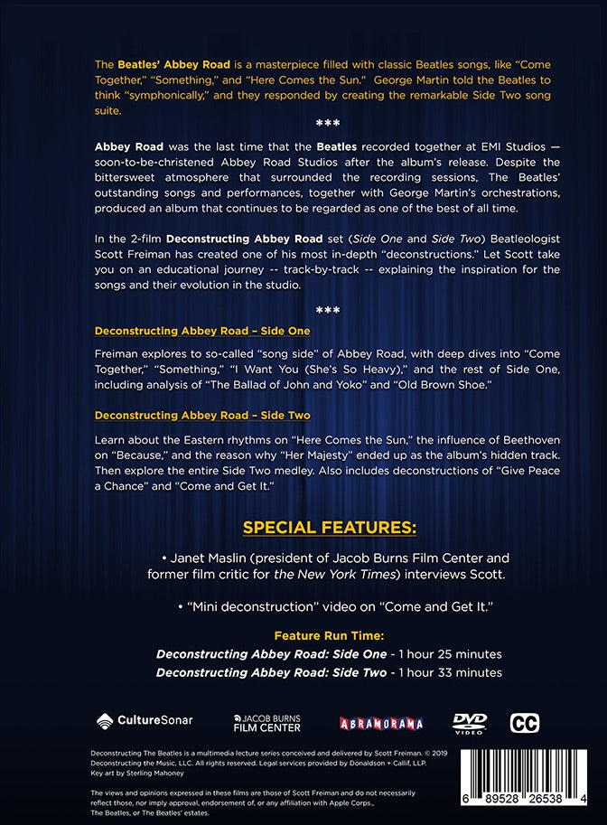 In the 2-film Deconstructing Abbey Road set (Side One and Side Two) Beatleologist Scott Freiman has created one of his most in-depth “deconstructions.” Let Scott take you on an educational journey -- track-by-track -- explaining the inspiration for the songs and their evolution in the studio.